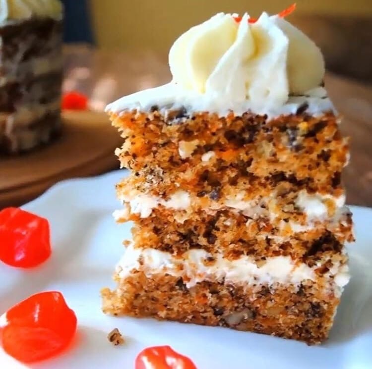 1. На мелкой тёрке натереть морковь. Измельчить орехи и цукаты. 2. В чашу просеять муку, добавить соль, разрыхлитель, соду, мускатный орех, корицу, орехи и цукаты, перемешать. 3. В отдельную чашу разбить яйца, добавить весь сахар ( коричневый и белый ), взбить до увеличения в размере. В взбитую массу добавить растительное масло, сок лимона и цедру, добавить морковь и перемешать. 4. Тесто разделить на 3 части и выпекать каждый корж при 175 градусах 17-20 минут. Размер моей формы 18 см. 5. Готовые остывшие коржи завернуть в плёнку и убрать в холодильник на пару часов. 6. Взбить мягкое масло, добавить сыр и перемешать, добавить сахарную пудру и перемешать до однородности. 7. С коржей срезать верхушки и собрать торт. Украшаем по желанию. Приятного аппетита !